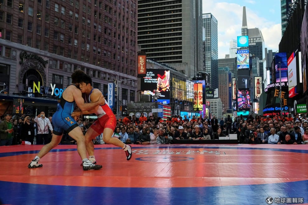 時代廣場舉辦「決鬥街頭」(Beat the Streets)摔角賽,照片中身穿藍衣的美國選手安迪(Andy Bisek)正在對抗南韓選手金先祐(音譯,Kim Hyeon-Woo)。