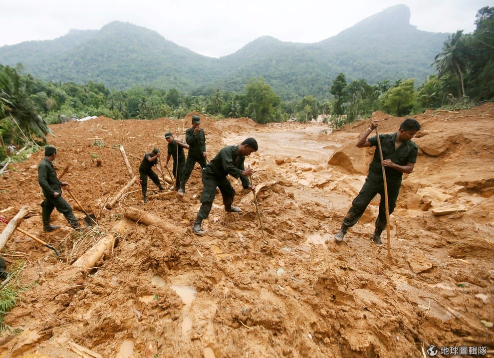 斯里蘭卡軍人們正在發生土石流的村子,進行搜救。近日,斯里蘭卡中南部遭到土石流重創,大量土石挾帶泥沙將整個村落掩埋,一名官員形容道:「就像那裡從來沒有村落一樣。」