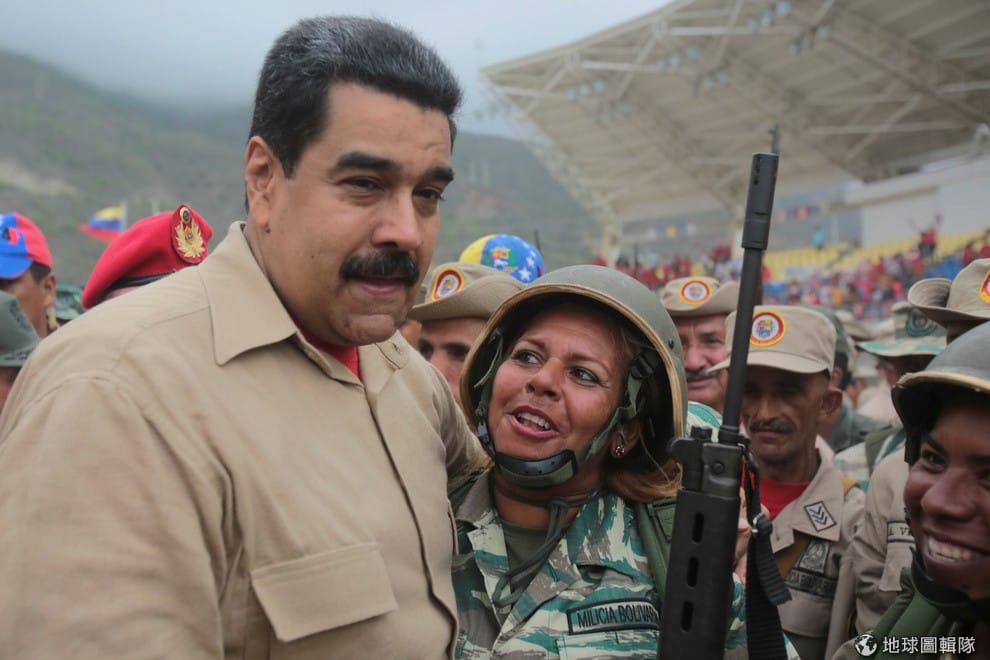 21號這天,深陷罷免危機的委國總統馬杜洛(Nicolas Maduro, 左)來到北部的拉瓜伊拉城(La Guaira),和支持他的民兵相見歡。近日,委國在野黨表示,他們已經成功收集了 185萬人的連署,要求舉辦全民公投把現任總統馬杜洛趕下台,希望能終結委國蕭條的經濟,讓人民不要再為了通貨膨脹與物資缺乏而煩惱。