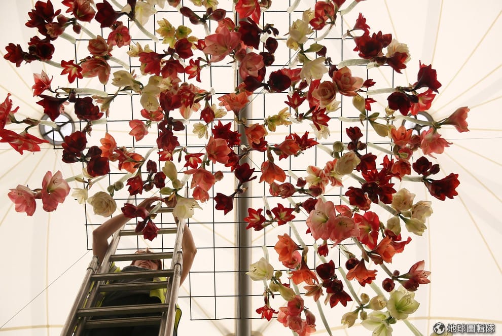 工作人員小心翼翼地調整懸吊在空中的鮮花,為一年一度的倫敦雀兒喜花展(Chelsea Flower Show)做準備。每年 5月,英國皇家園藝協會(Royal Horticultural Society)都會在倫敦的雀兒喜皇家醫院舉辦花展,會場中會展出盆栽、花洋裝、花草藝術等各式展品,同時也會舉辦園藝設計比賽讓參賽者一爭高下。除了世界各地的遊客會來參觀外,英國女王伊莉莎白二世也不會缺席這場盛事。
