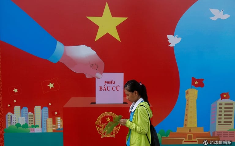 一名女孩走過越南共產黨的宣傳海報,呼籲人民投票選出新任國會代表和省、縣、村議員。在一黨專政的越南,每 5年會開放人民直選國會代表,這也是人民難得行使投票權的時機。