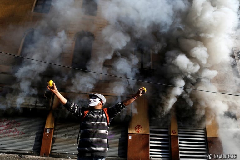 一名反政府的抗議民眾戴著面具,在冒出陣陣濃煙的大樓前抗議智利總統巴舍萊(Michelle Bachelet)的教育政策和貪污醜聞。同一時間,巴舍萊總統正在國會發表國情咨文。智利警方擔心抗議活動影響總統安全,也加派人手維護秩序。