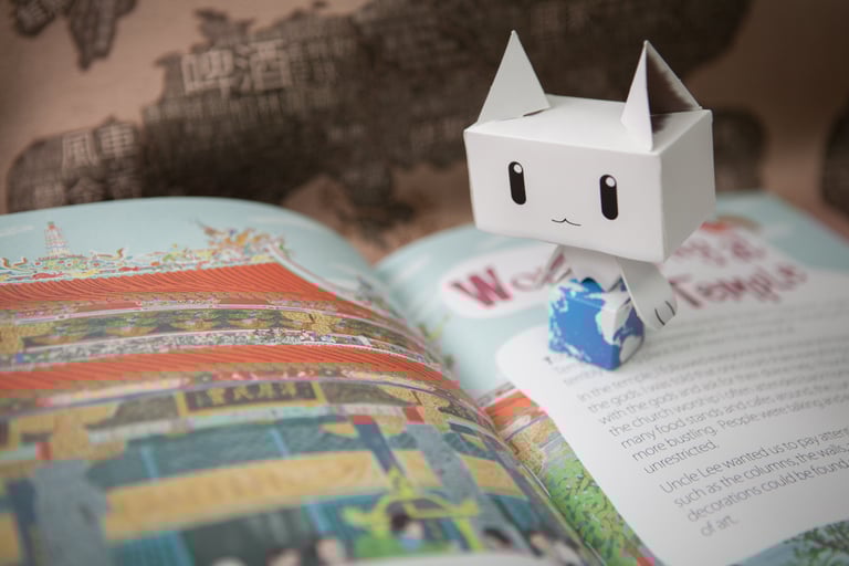 到廟裡拜拜祈福,是我們習以為常的事情,但是在小男孩Eric的眼中,不論是拿香、廟宇的設計或是門神圖樣都看來相當新鮮,在書中的Worshiping at the Temple(到廟拜拜)單元中,就會介紹到石獅的功用是要趕跑邪靈保護廟宇,台灣每年都會熱鬧起來的七月半「鬼月」也在書中有著詳細的解說。