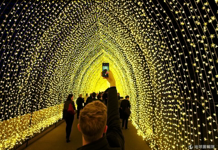 一名遊客拿起手機和燈海美景自拍。25號這天,雪梨當地正在舉辦燈節,城市中著名的地標都共襄盛舉,用華美的燈飾點亮整個城市,吸引遊客的目光,英國倫敦也不落人後,在今年 2月推出精緻非凡的花燈展。
