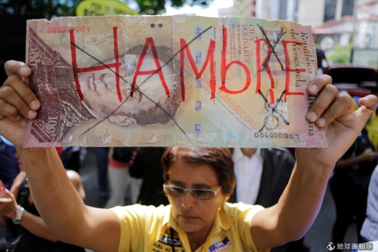 抗議民眾高舉一張放大的紙鈔,上面寫著「飢餓」的字樣,上街要求委內瑞拉總統馬杜洛(Nicolas Maduro)下台。隨著委內瑞拉經濟一落千丈,國內陷入一片混亂,原料缺乏也迫使可口可樂不得不減產,而委內瑞拉也因為通貨膨脹的關係,一個漢堡要價台幣 5,595元,讓人買不下手。