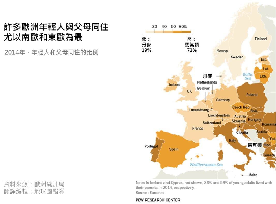 根據歐盟歐洲統計局的調查,圖中顏色越深的部分代表 18-34歲的年輕人和父母同住的比例越高,2014年比例最高的國家是馬其頓,比例最低的是丹麥。