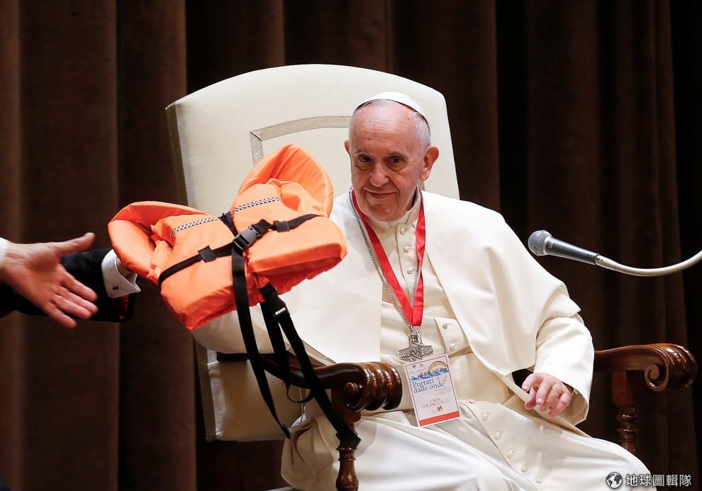 羅馬天主教宗方濟各(Pope Francis)手上拿著一件橘色救生衣,救生衣的主人是一名逃離戰亂家園的難民,他已經不幸溺斃在地中海,教宗希望藉此喚起大眾對難民的關懷。