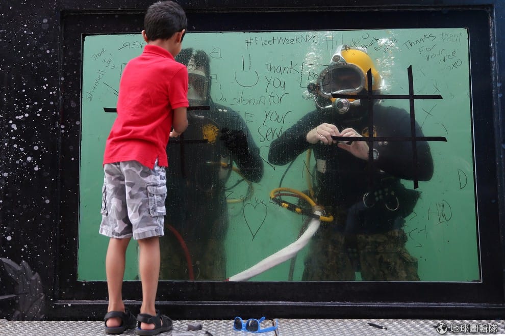 一名小男孩和潛在水缸中的美國海軍玩起了井字遊戲,這個大水缸就放在熱鬧非凡的紐約時代廣場,讓路過的大眾一窺美國海軍平日的訓練和幽默的一面,拉近和大眾的距離。今年一月,美國海軍在波斯灣航行時被伊朗拘留,這起事件讓美國和伊朗陷入緊張,也使原本雙方和緩的關係蒙上陰影。