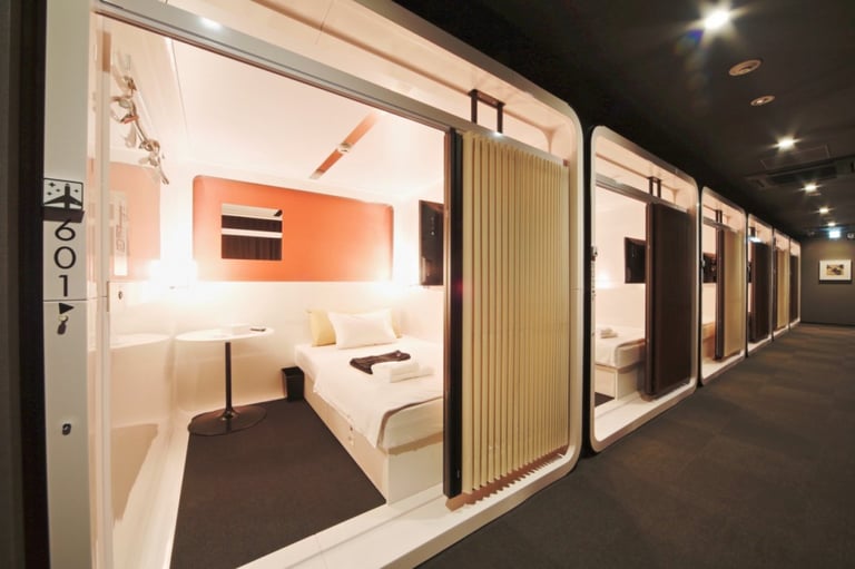 位置基本上都十分良好,根據地點有些分店配置有廣大的交誼廳和會談室,有些則較為狹小,但基本上全部都配置大浴場、獨立淋浴間和廁所,另由於房間僅有簾幕遮掩且無法上鎖,故為了確保女性顧客安全,男女區域獨立且無法溝通。房型分為「商務艙」和「頭等艙」。商務艙就是一般的膠囊旅館,室內空間約 2.5 平方公尺,而頭等艙就是多了一個放行李、站立的空間和小桌子,室內空間約 4.4 平方公尺。