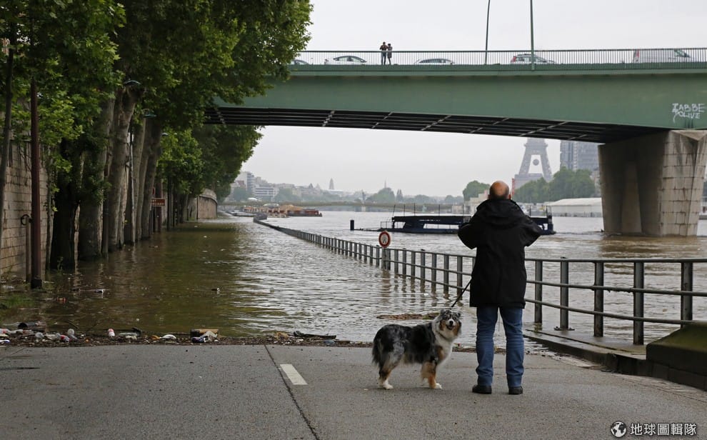 巴黎市區內,民眾看著淹大水的塞納河畔。連日大雨讓德國、法國與比利時都傳出嚴重水災,其中德國已知至少 6位居民不幸喪生,法國也傳出民眾身亡的消息,預計淹水情況仍會持續下去。