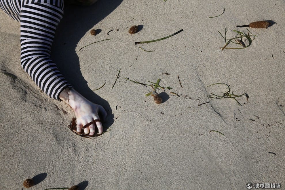 溺斃難民的手無力地癱倒在沙灘上,