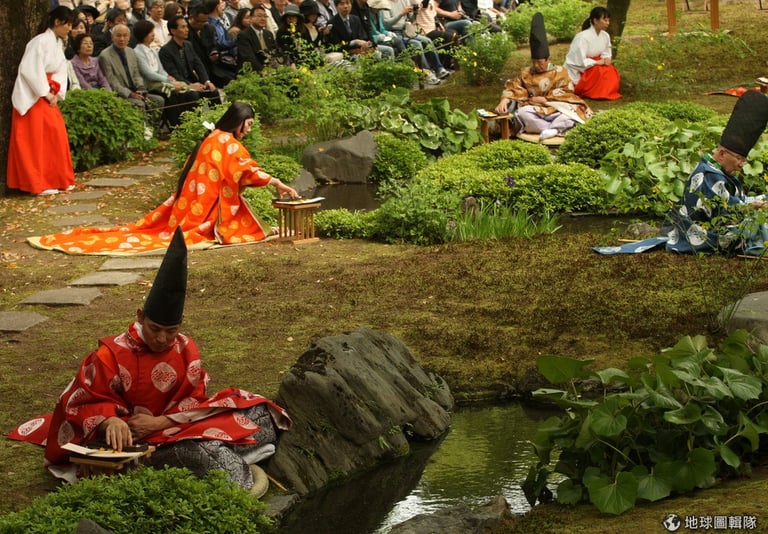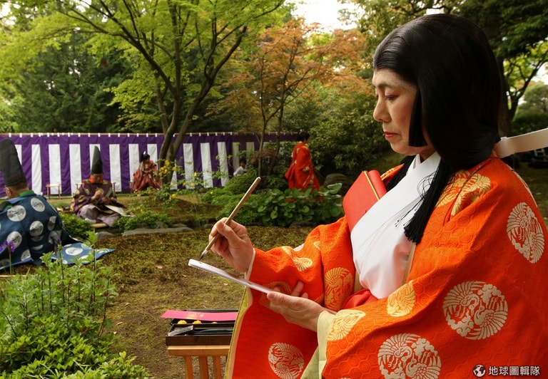 身穿日本平安時代貴族服裝的女子,在城南宮的庭園內寫起俳句。Buddhika Weerasinghe/Getty Images