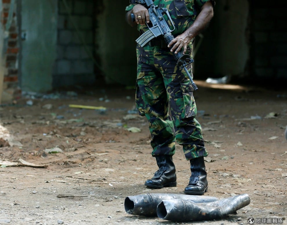 隸屬特殊任務部隊(STF)的士兵站在通往爆炸現場的道路上,他的腳邊是迫擊砲的殘餘,這條道路通往的地點是斯里蘭卡最大的砲彈掩埋場,在不久前傳出爆炸後開始有士兵進駐。