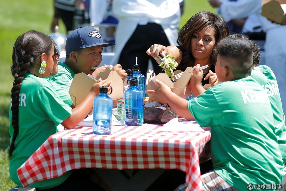 美國第一夫人蜜雪兒(Michelle Obama)與學童們一起享用從「白宮農園」採摘下的蔬菜當午餐。