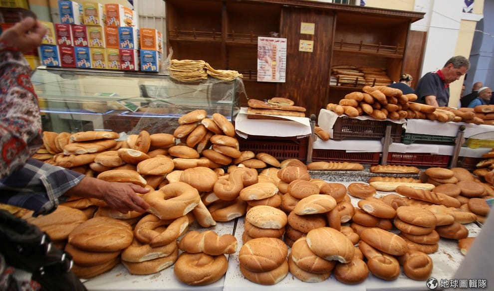 6號這天齋戒月開跑,突尼斯市內的市場可見小販忙著將麵包擺好販售。