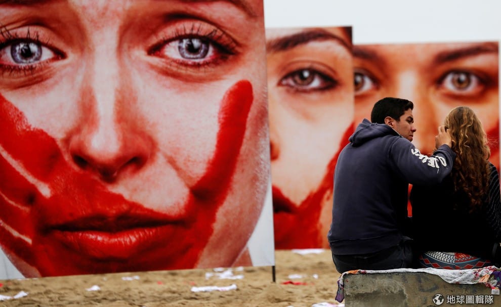 示威民眾坐在由攝影師費雷伊塔斯(Marcio Freitas)所拍攝的作品前。近日巴西當地的非政府組織(NGO)「和平里約」(Rio de Paz)發起抗議女性暴力的示威活動。