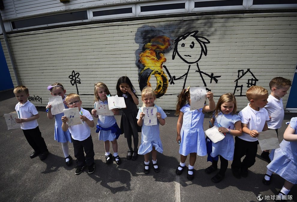 學前班的小朋友們,站在藝術家班克斯(Banksy)的塗鴉前秀出他們的畫作。