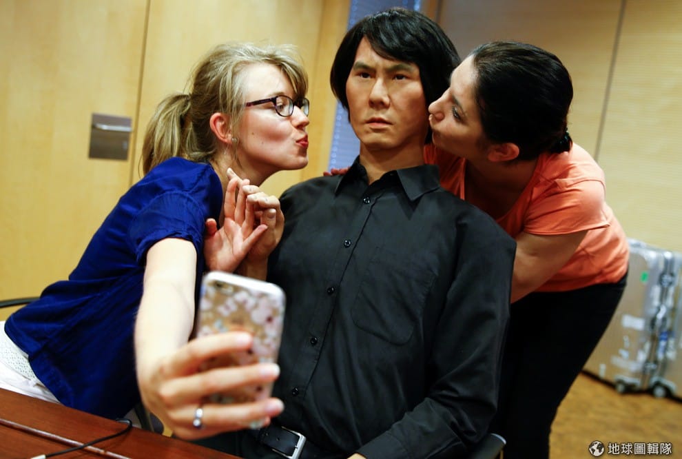 德國零售巨人麥德龍(Metro AG)員工作勢親吻機器人「HI-4」,這座機器人是仿自日本大阪大學工學教授石黑浩的外型所做,使用了鋼鐵骨架、塑膠頭骨以及矽膠皮膚製成,能用遠端操控的方式操作。