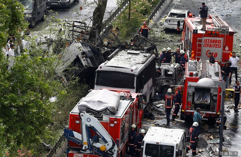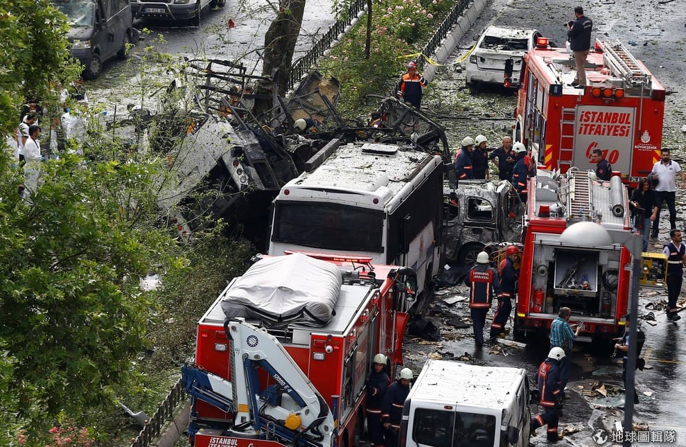 伊斯坦堡市區內,消防員與鑑識員正在剛受到炸彈攻擊的現場蒐證。報導指出, 7號當天一輛警方巴士今天遭到汽車炸彈攻擊,造成11人死亡,其中7人是警察,土耳其警方已經逮捕了4名嫌犯。後續還沒有團體出面承認犯行。