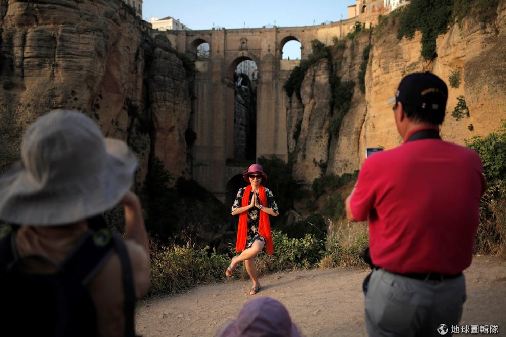 中國遊客在新橋前擺姿勢照相。隆達(Ronda)位在西班牙南部,這裡有一座跨越120公尺深谷的「新橋」(Puente Nuevo),這座橋在平日夜晚(中)會打上燈光,響應活動這天可見新橋瞬間消失在黑暗中(下)。這座橋建於 1751年,共修建 42年,據稱造成 50名工人死亡。