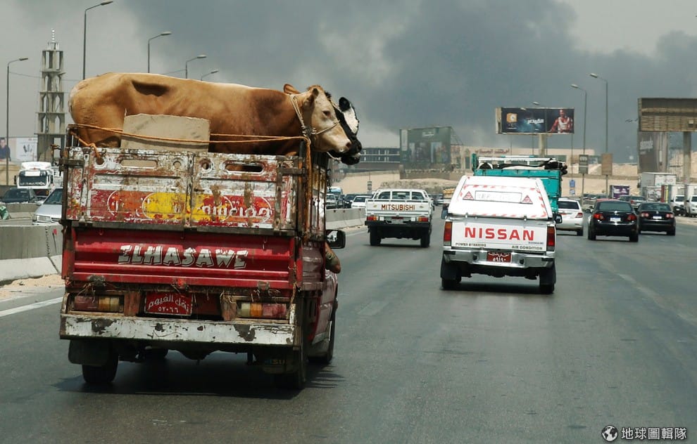 適逢齋戒月,開羅街上可見載著準備送進屠宰場牛隻的貨車。食物在齋戒月成了重要的一環。