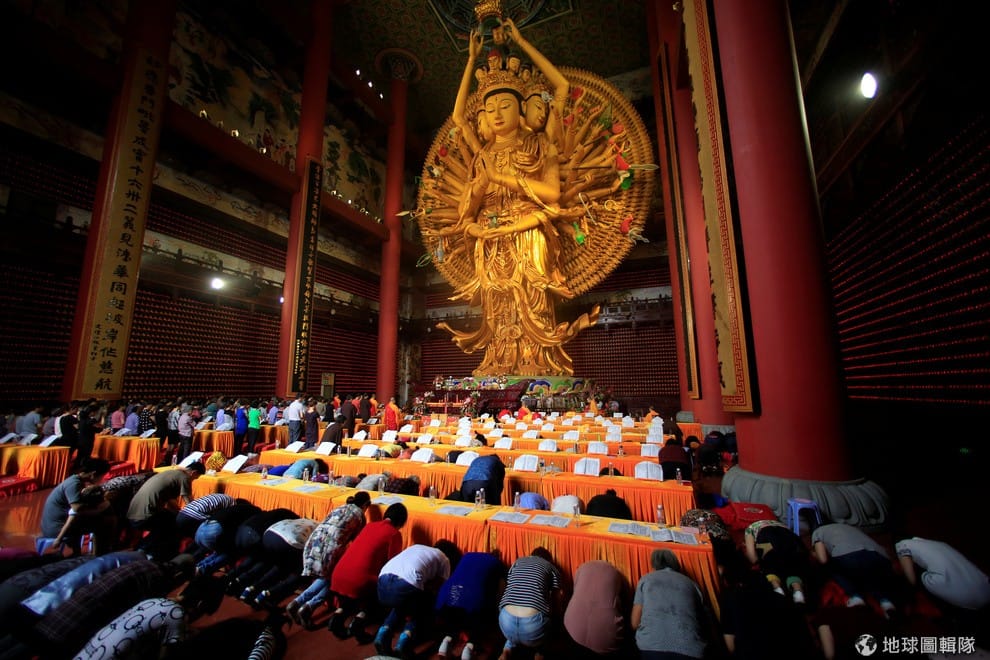 替家人祈求大學入學考順遂的人們齊聚在上海的東林寺。