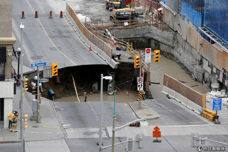 渥太華市內,工人們看著巨大的地洞,當地在 8號時傳出地面陷落的消息,也進一步引發天然氣外洩和水管爆裂,幸好無人受傷。