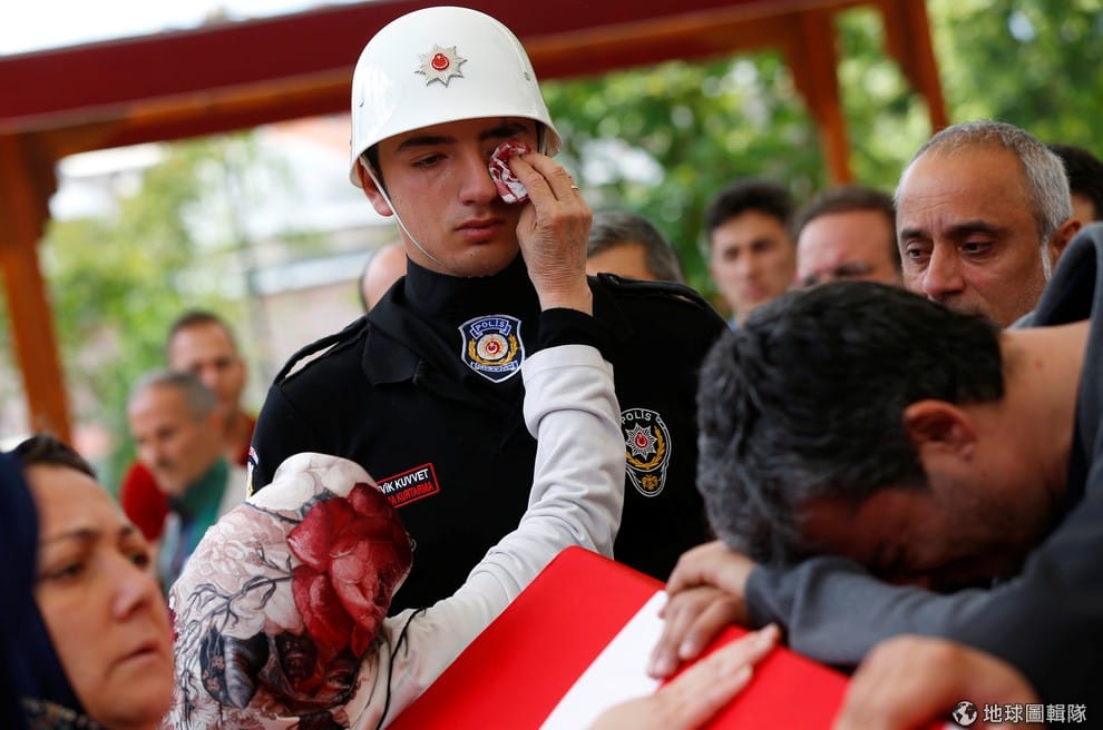 棺木旁的榮譽守衛忍不住掉淚,一旁的民眾替他將眼淚擦去。棺木中躺的是警察卡拉葛茲魯(Kadir Cihan Karagozlu),他在 7號炸彈攻擊中不幸喪生。報導指出, 7號當天一輛警方巴士今天遭到汽車炸彈攻擊,造成11人死亡,其中7人是警察,土耳其警方已經逮捕了4名嫌犯。後續還沒有團體出面承認犯行。