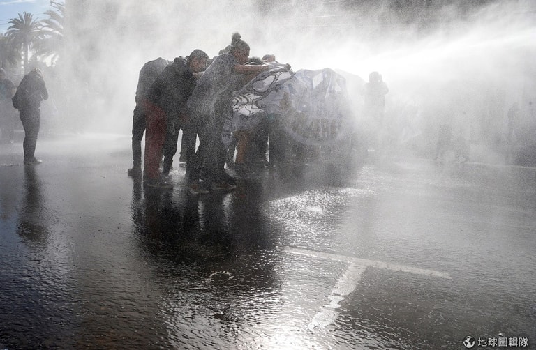 抗議政府教育政策的示威者被鎮暴警察以水柱沖擊。不久前,台灣學生在抗議「黑箱課綱」的同時,智利學生也為了他們的教育走上街頭,要求政府降低學費,讓他們參與教育政策的決策。