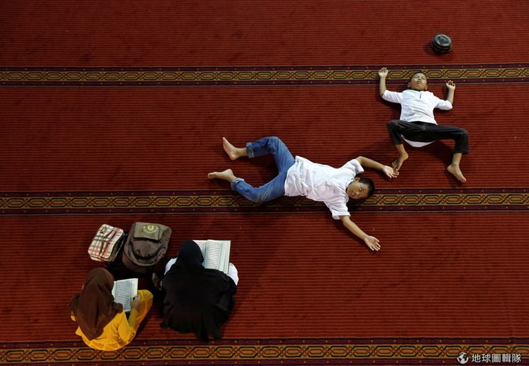 雅加達市內,伊斯蒂克拉爾清真寺(Istiqlal mosque)內,穆斯林誠心祈福,一旁的小朋友則呼呼大睡。