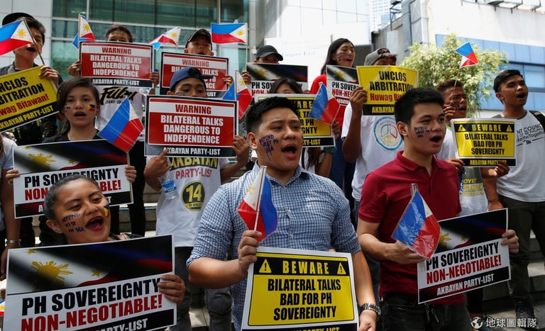 菲律賓市內的中國大使館前,菲律賓的公民行動團體拿著標語抗議中國處理南海問題態度。報導指出,南海主權爭議持續,中國與菲律賓就海洋劃界問題等,交荷蘭海牙國際法庭仲裁一案,將於數周後有最終裁決。中國外交部 8號發出聲明,批評菲律賓關閉通過談判解決南海爭議大門,並堅持問題只能通過雙邊談判解決,決不接受海牙法庭仲裁結果。