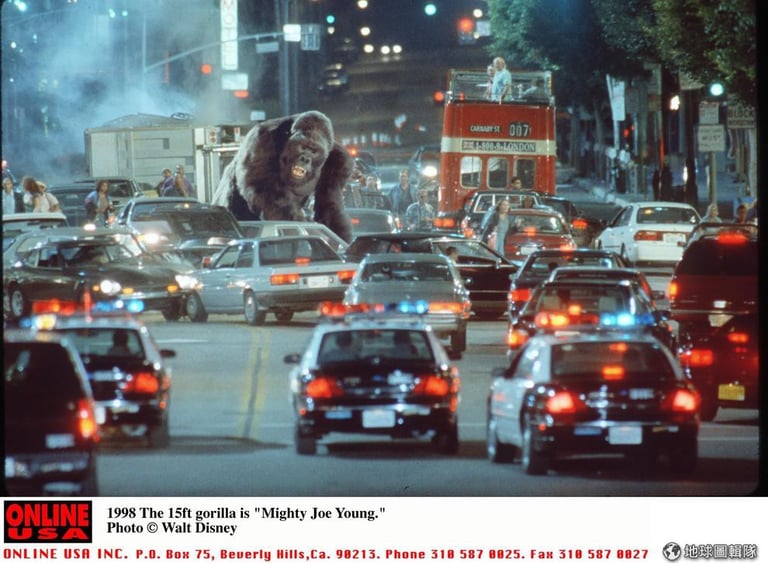 照片中是1998年的電影《巨星喬陽》,這部已經被翻拍數次的經典電影,算是哈利豪森的啟發之作。當年他在歐布萊恩(Hugh O'Brian)的手下協助製作電影《巨星喬楊》(Mighty Joe Young),這部片也獲得1949年奧斯卡特效獎,這次的經驗啟發他後來無數優秀作品。Getty Images/Handout