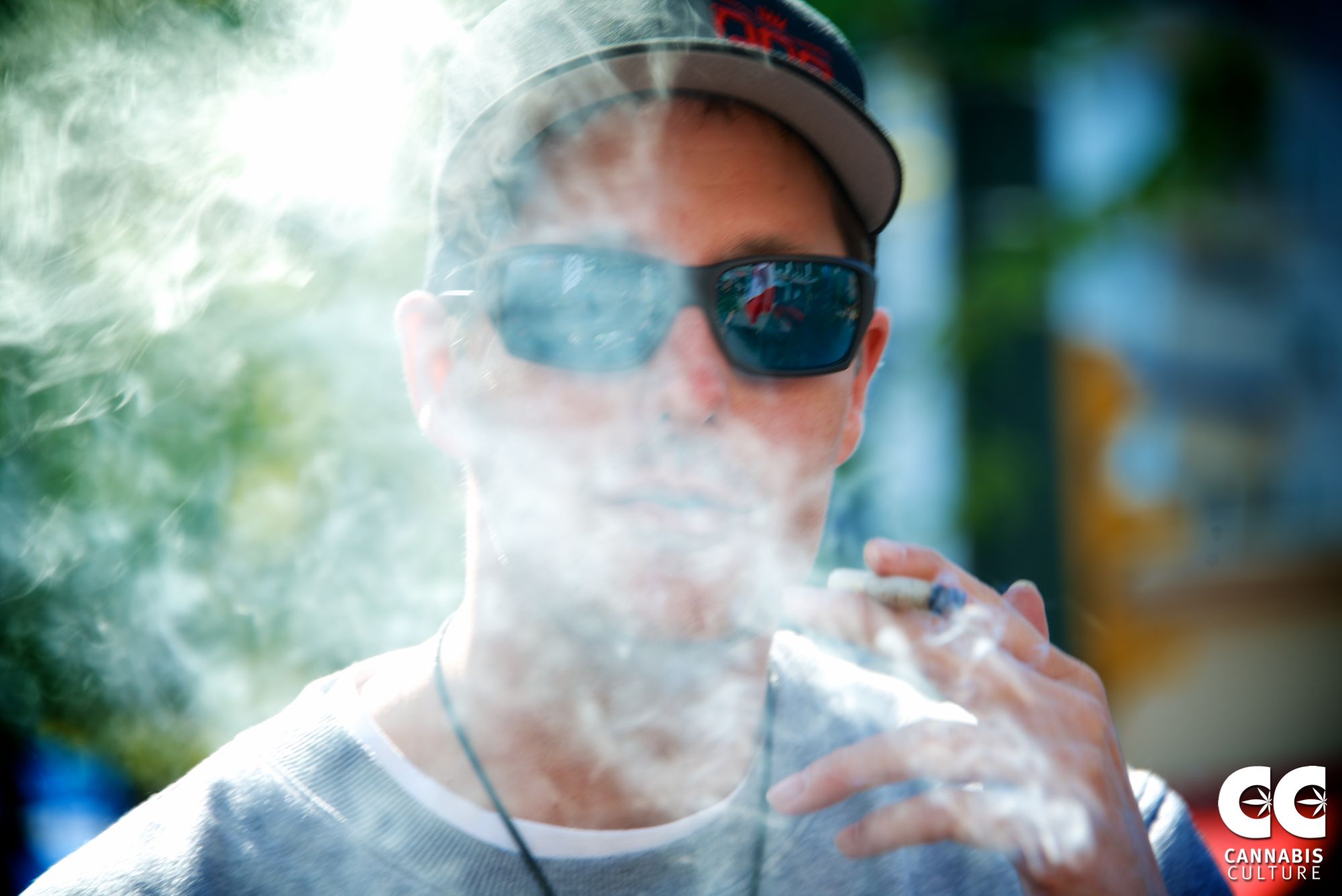一名男子對著鏡頭吞雲吐霧,享受大麻帶來的裊裊煙霧。