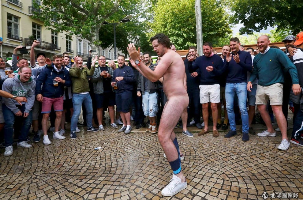 英國球迷齊聚法國中部的聖埃蒂安市(Saint Etienne),準備觀賞英國對上斯洛伐克的足球賽,廣場上一名球迷全身赤裸,炒熱現場氣氛。