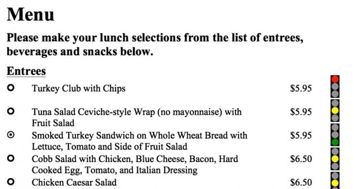 根據一份美國賓州大學和卡內基美隆大學合作的研究,他們發現透過菜單旁的紅綠燈標示,人們會轉而點選熱量較低的餐點,整體購買的卡路里加起來少了 10%。