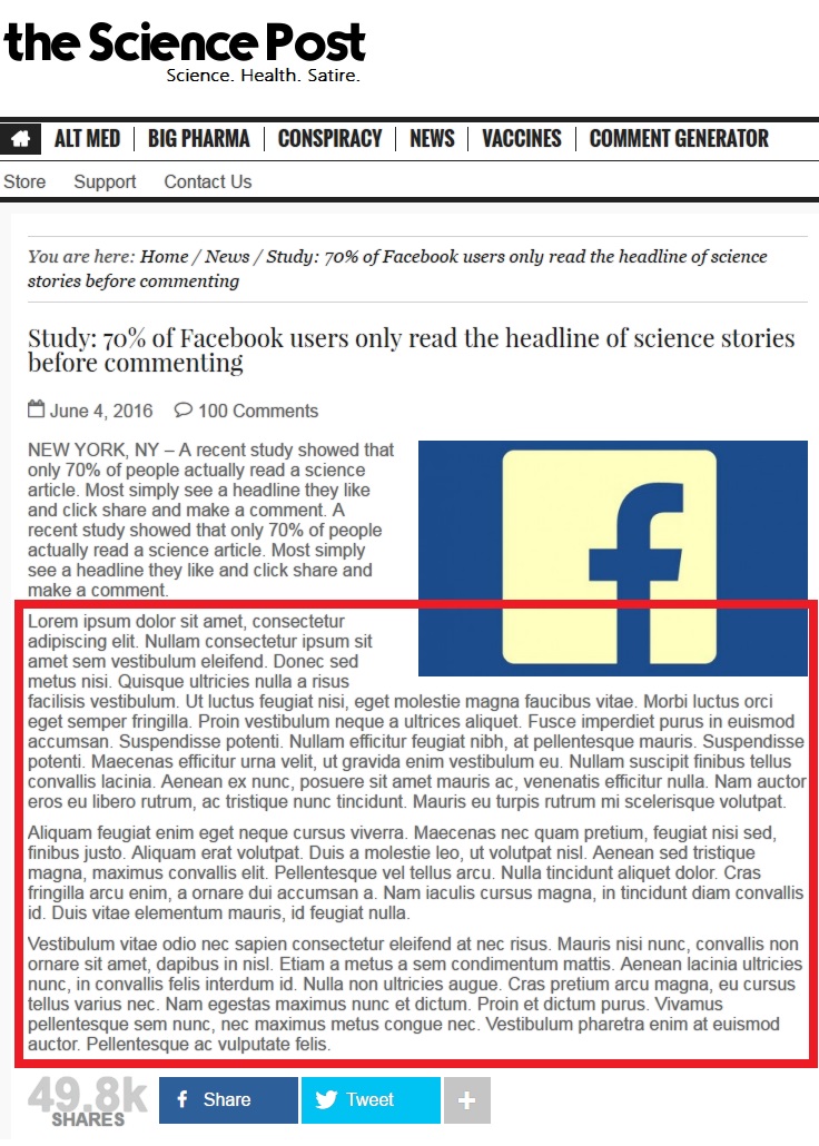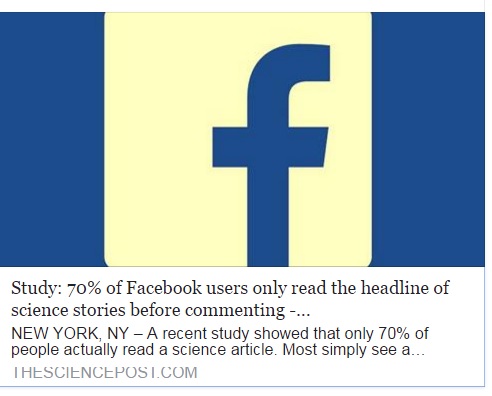 不久前,關注科學和醫療新知的《科學郵報》發出了一篇文章:「70%的Facebook網友看到科學報導時,只看大標就留言」,這篇文章引起極大的迴響目前已得到將近 5萬次轉分享,但或許有不少人不知道,這篇文章是假造的。