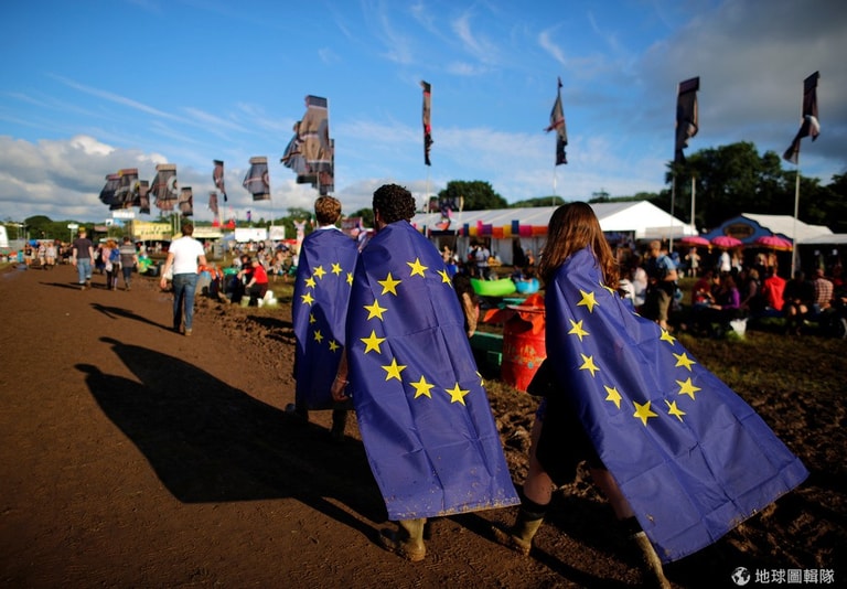 參加格拉斯頓伯里音樂節(Glastonbury Festival)的民眾,披上歐盟旗幟希望英國民眾在脫歐公投當天可以支持留歐。