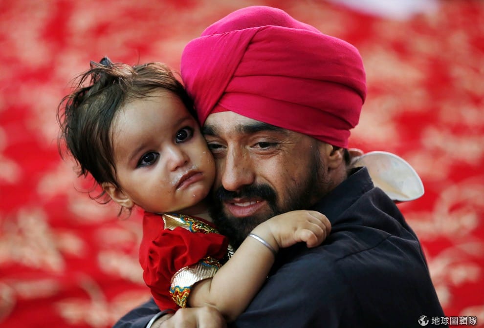 一名錫克教信徒抱著女兒,在錫克教寺廟參加宗教儀式。