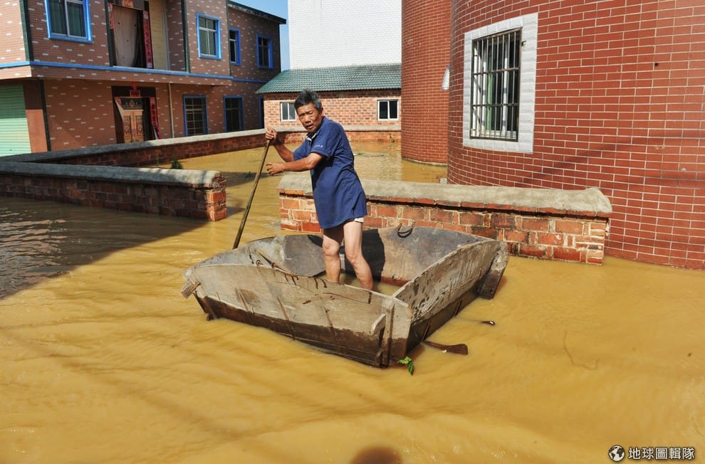 一名男子撐著自製的小船,在滾滾泥流中滑行。22號這天,中國江西省鄱陽縣遭到洪水侵襲,整個村落幾乎被洪水淹沒,道路變成汪洋一片,水面上漂浮著民眾的日常用品還有木塊等物。目前當局加緊腳步救災,尚未傳出傷亡消息。