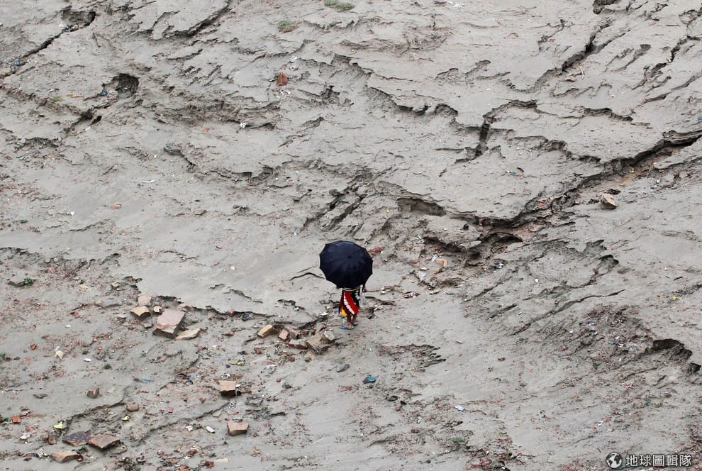 在恆河沿岸,一名男子撐起雨傘抵擋從天而降的雨水。