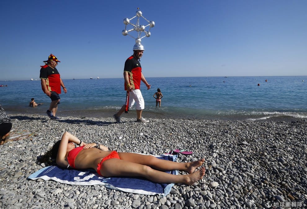 一名比利時球迷頭上頂著原子球塔(Atomium)模型,走過海灘。時值 2016歐洲足球盃在法國開踢,歐洲各國球迷紛紛湧入法國為國家足球隊加油,他們往往會佩戴象徵自己國家的飾品。