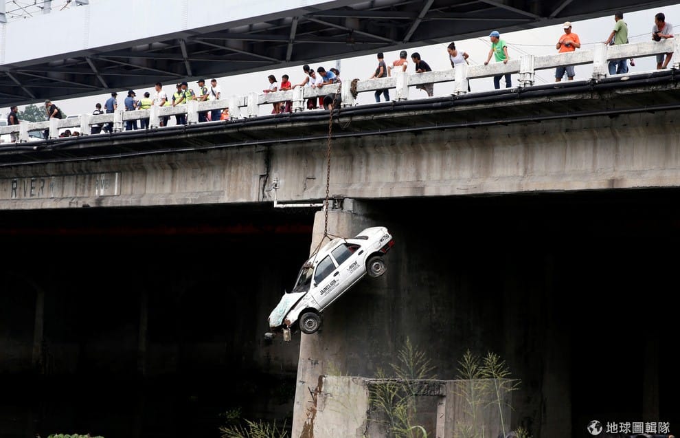 民眾站在橋上看著被吊掛著的汽車,當地正在舉行大型防震演習,當局將汽車吊掛模擬地震發生後的情景。