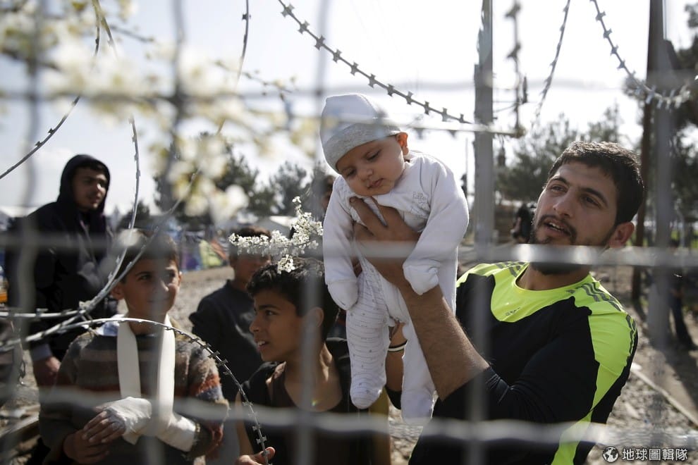 一名父親將懷中的嬰兒舉起,希望鐵絲網另一頭的守衛可以放行,讓他們越過希臘和馬其頓的邊境往西歐前進。