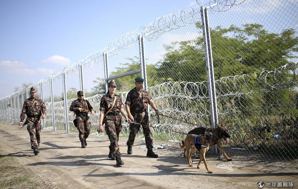 網友SUKHCHULUUN匈牙利軍人牽著狼犬,在和塞爾維亞接壤的柵欄旁巡邏,嚴防難民入境。