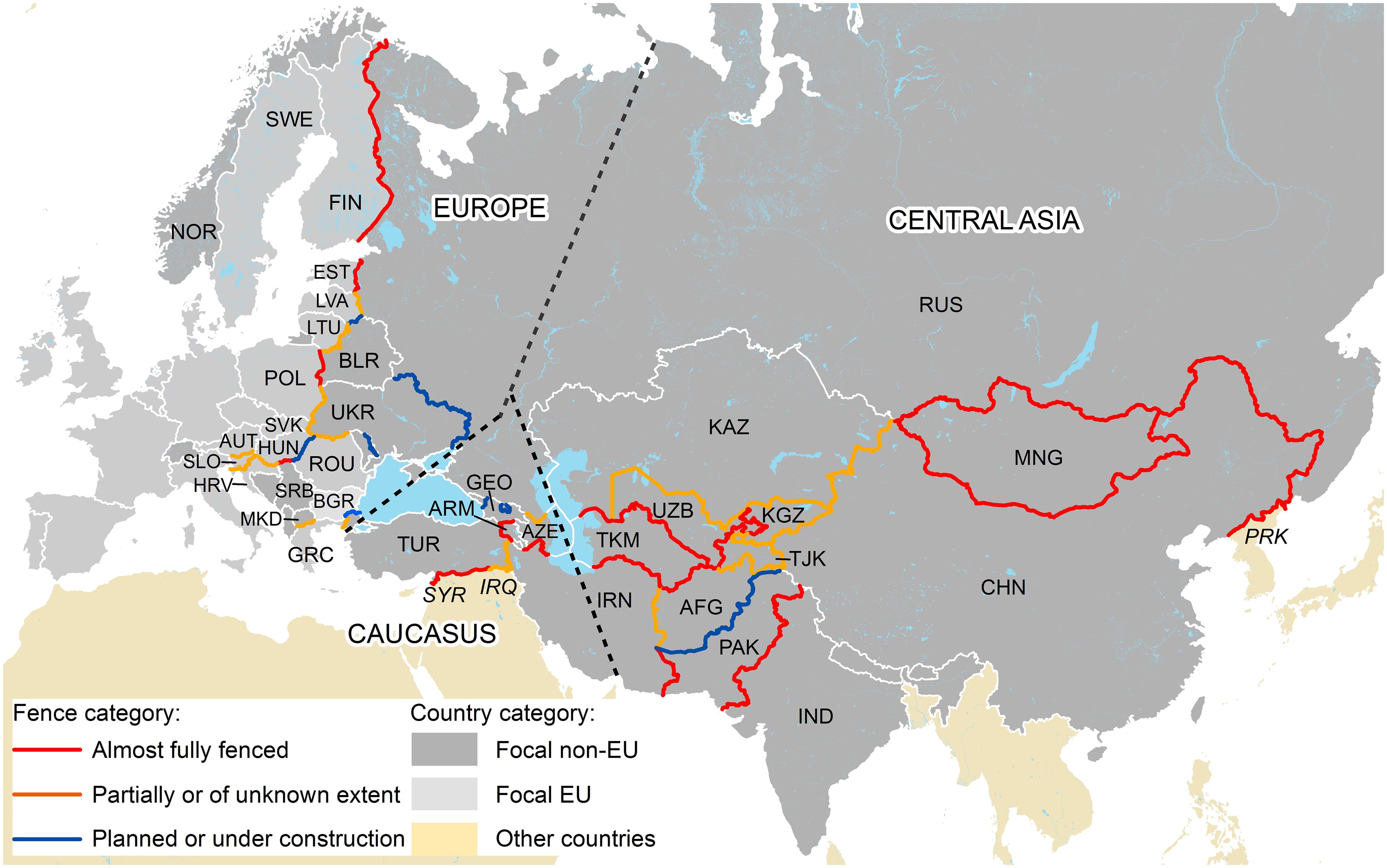 圖為歐亞地區的邊界圍籬圖,紅色代表幾乎全以圍籬隔開,橘色代表部分或不清楚圍籬隔開的程度,藍色則代表預計設置或正在設置的圍籬。