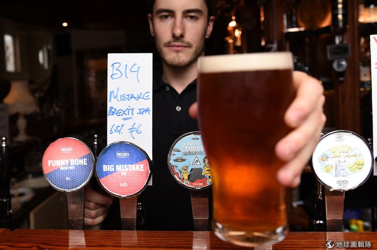 一名調酒師端出專為英國脫歐釀製的啤酒,這款啤酒叫「大錯特錯」。