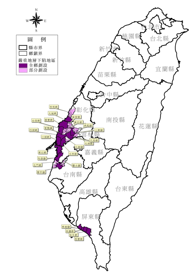反觀台灣,根據經濟部水利署的資料,2015年台灣地層下陷最嚴重的區域在雲林,目前持續下陷面積達 658.6平方公里,歷年最大累積下陷量 2.54公尺,2015年最大累積下陷速率 7.1公分。下陷最嚴重的第二名是嘉義地區,目前持續下陷面積達 90.9平方公里,歷年最大累積下陷量 1.53公尺,2015年最大累積下陷速率 4.4公分。