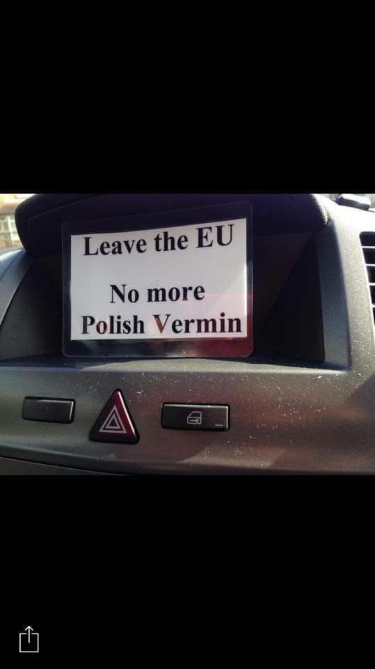 倫敦東區的亨廷登(Huntingdon),也有人將「脫歐──再也不要有波蘭害蟲」的標語丟到信箱騷擾居民。