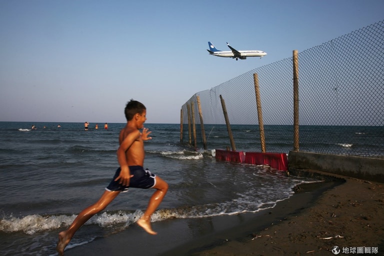 一名小男孩在海灘上開心奔跑,天空上一架飛機準備降落拉納卡國際機場,帶來更多前來享受夏日假期的遊客。