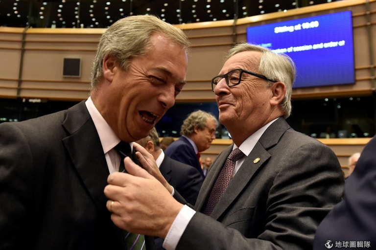 支持英國脫歐的英國獨立黨(UKIP)黨魁法拉吉(Nigel Farage,左)來到布魯塞爾,受到歐盟委員會主席榮科(Jean-Claude Juncker )的歡迎,各國代表也紛紛來到會場,準備就英國脫歐一事進行協商。